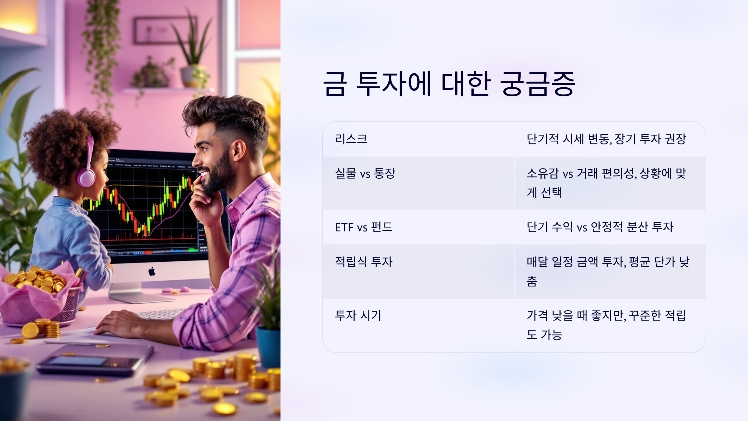 A5: 금은 장기적인 가치가 있는 자산이므로, 가격이 낮을 때가 가장 좋지만, 꾸준히 적립식으로 투자해도 큰 부담 없이 시작할 수 있습니다.