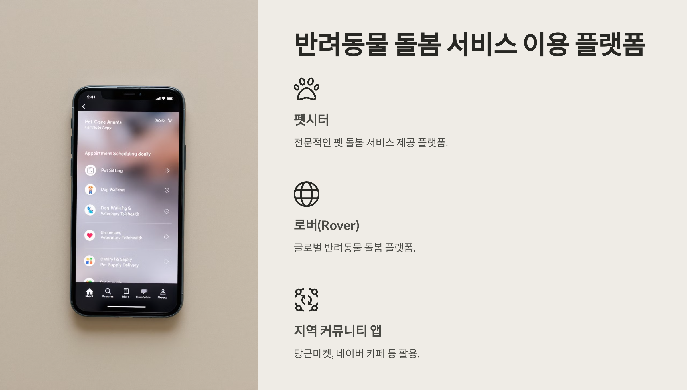 - 일일 방문 돌봄: 반려동물의 식사, 배변 처리, 놀이를 제공.