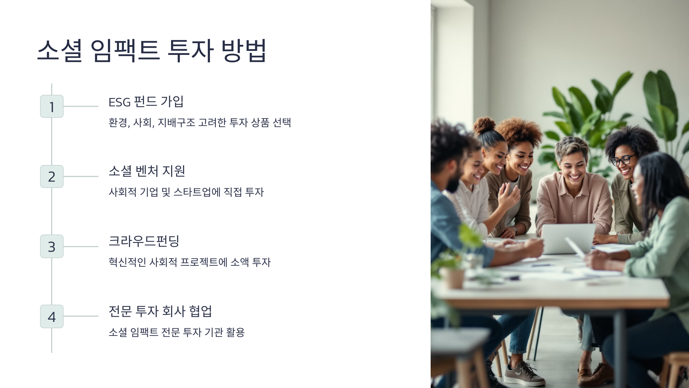 - 전문 투자 회사와 협업: 소셜 임팩트 전문 투자 기관 활용.