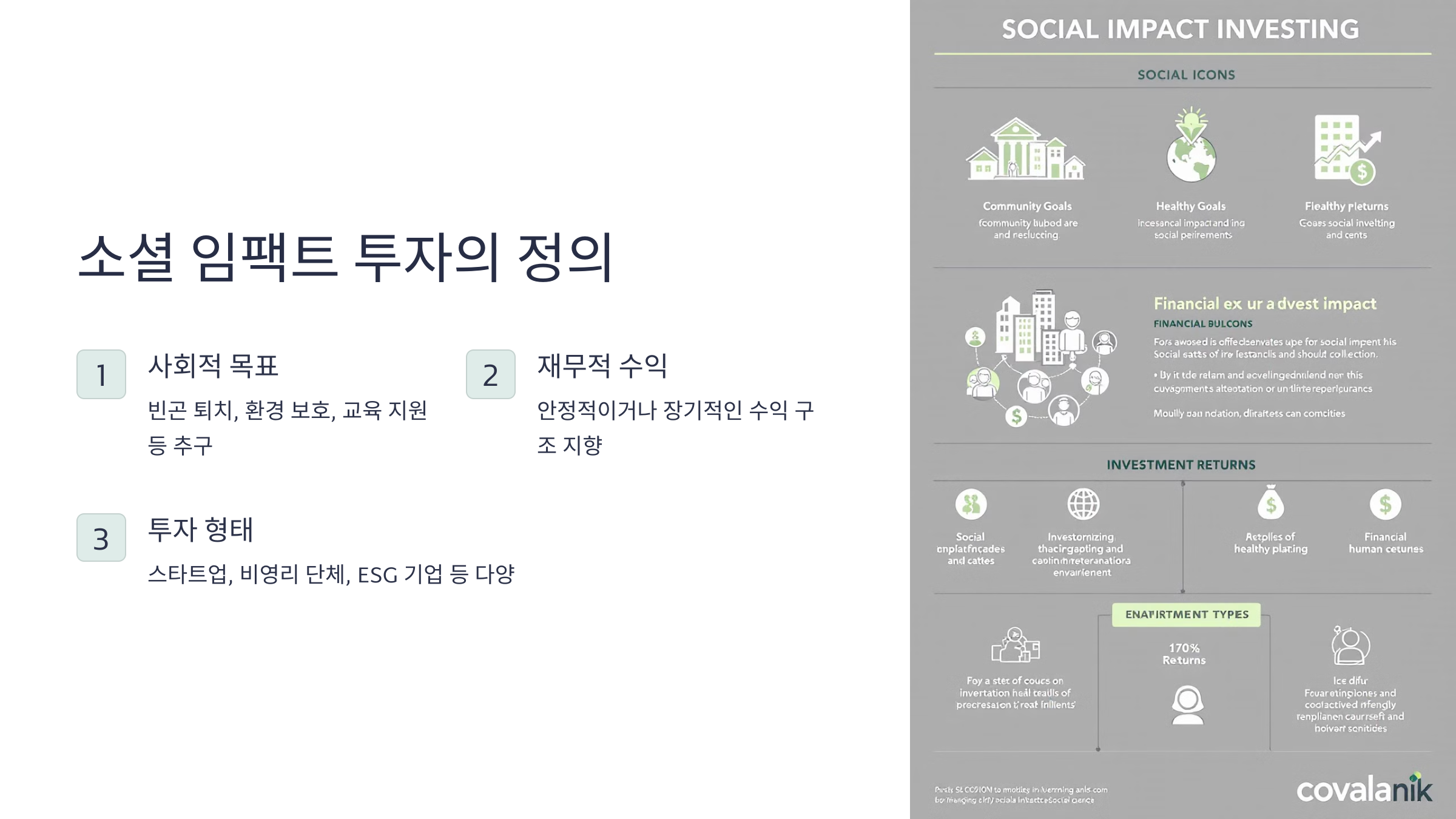 - 경제적 가치 창출: 사회적 가치를 창출하면서도 재정적 이익을 얻는 투자 기회.