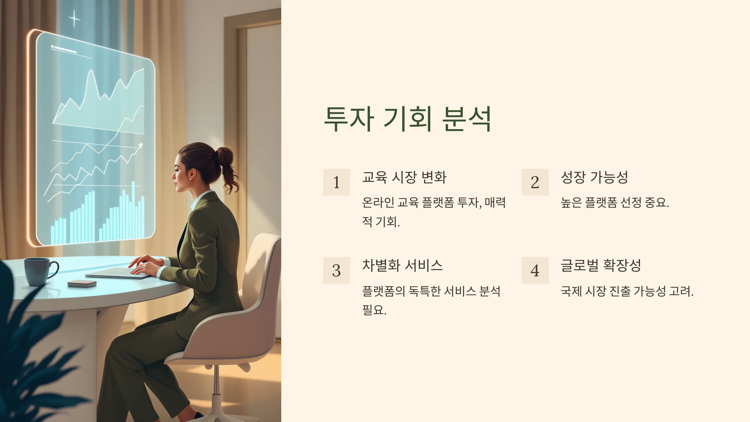 온라인 교육 플랫폼에 대한 투자는 교육 시장의 변화와 맞물려 매력적인 기회가 될 수 있습니다. 특히, 성장 가능성이 높은 플랫폼을 선정하여, 플랫폼이 제공하는 차별화된 서비스와 글로벌 확장성을 분석하는 것이 중요합니다.