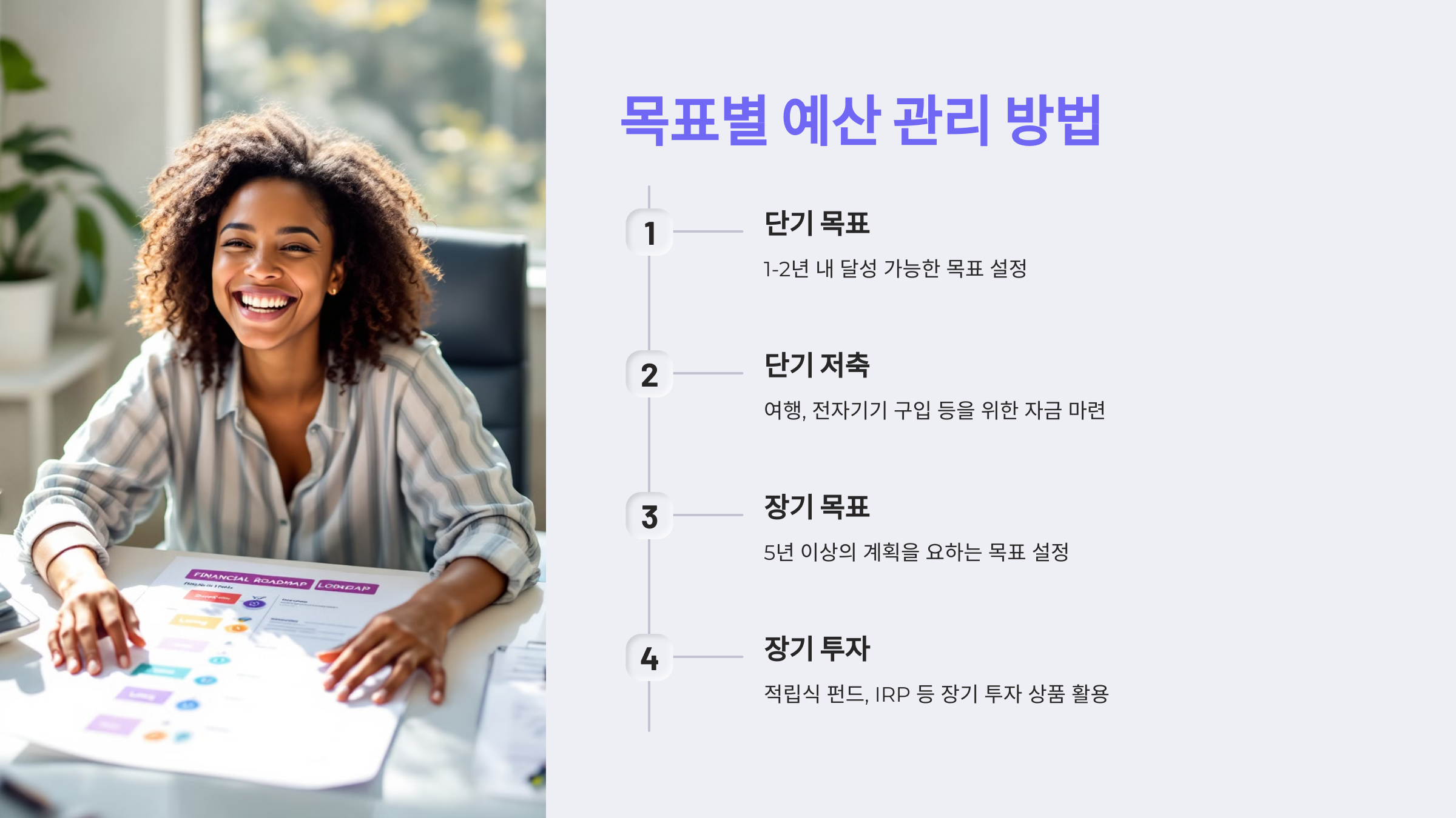 장기 목표는 은퇴 자금, 주택 마련 자금 등 5년 이상의 계획을 요하는 목표입니다. 적립식 펀드나 IRP(개인형 퇴직연금) 등의 장기 투자 상품에 분산하여 꾸준히 투자하는 것이 좋습니다.