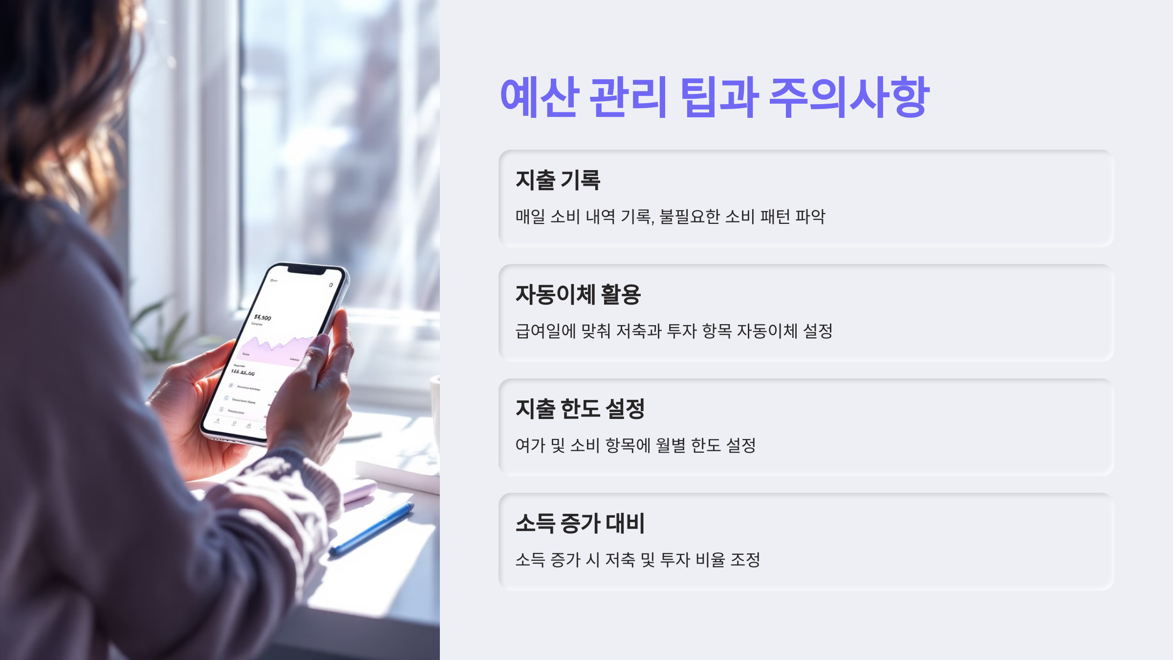 - 소득 증가 대비: 소득이 증가하면 저축 및 투자 비율을 늘리는 등 예산을 재조정