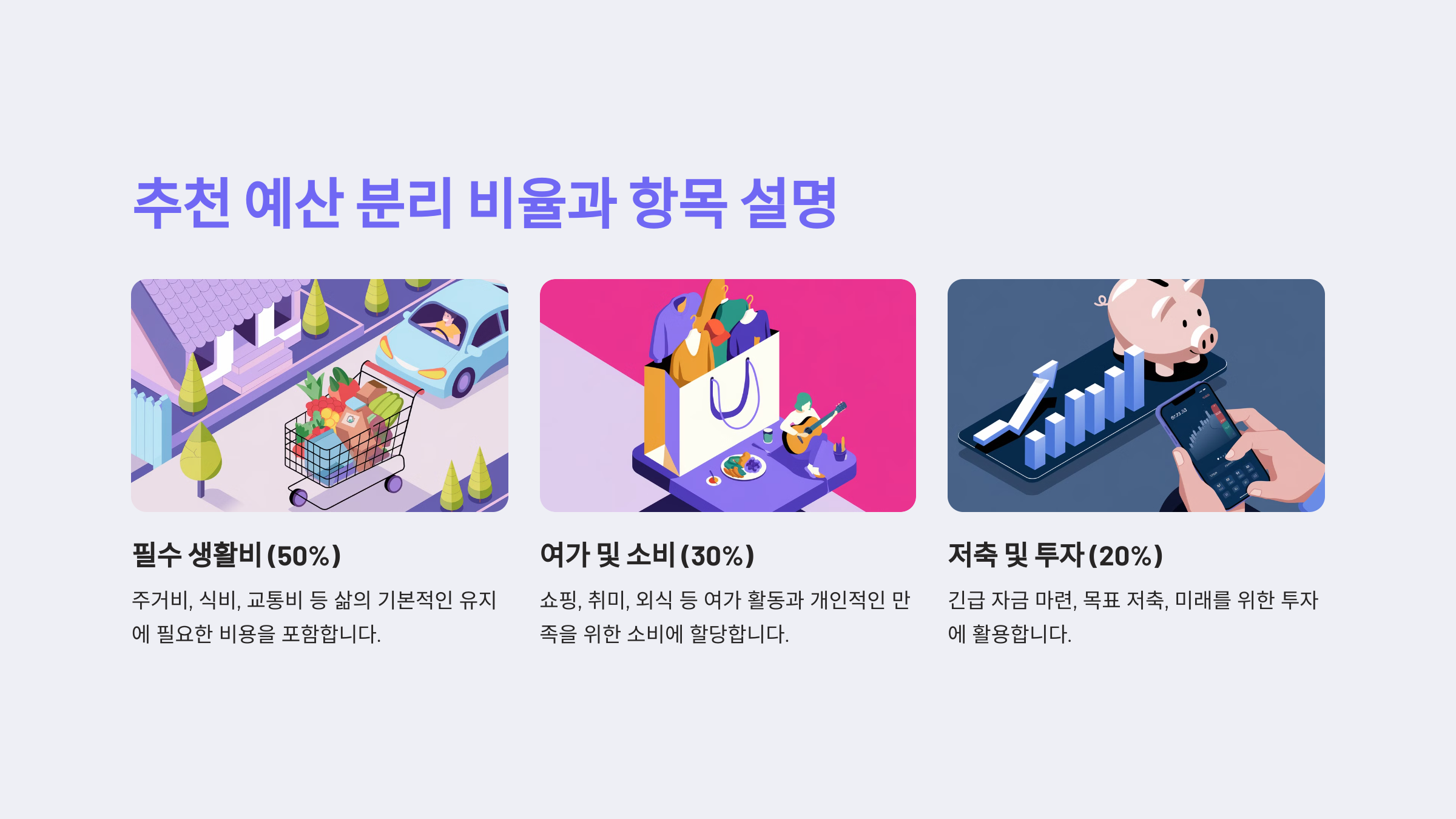 - 목표 자산 형성: 저축 및 투자 비중을 늘려 미래를 위한 자산 축적 가능