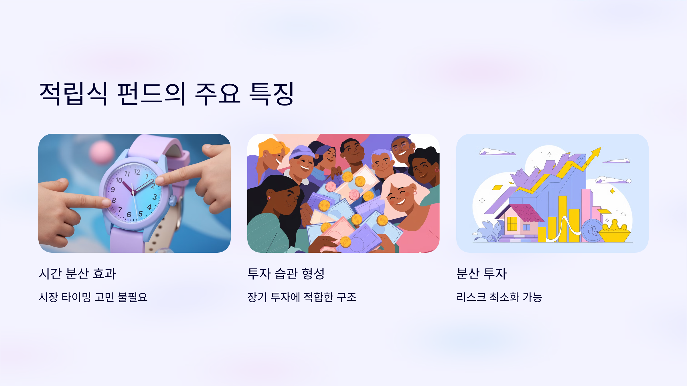 적립식 투자 방식은 시간 분산 효과를 통해 시장 변동성을 완화하고, 단기적인 리스크를 줄이면서 안정적인 투자 성과를 기대할 수 있습니다.