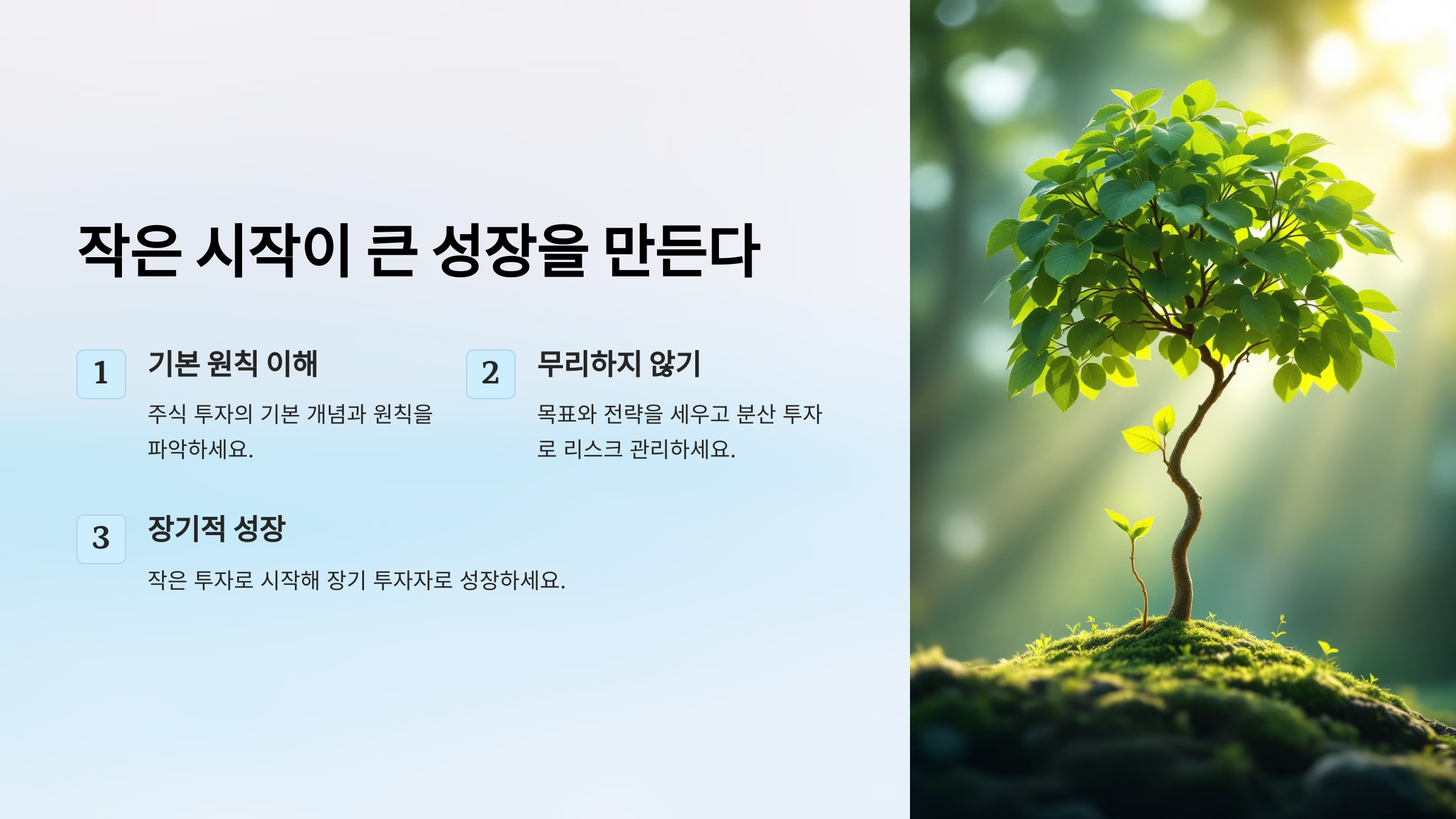 주식 투자는 처음에는 어렵고 복잡하게 느껴질 수 있지만, 기본 개념과 원칙을 이해하고 조금씩 경험을 쌓아가면 누구나 할 수 있는 재테크 방법입니다. 절대 무리하지 않고, 목표와 전략을 확실히 세우며 분산 투자를 통해 리스크를 줄이세요. 작은 투자부터 시작해 자산을 늘려가는 재미를 느끼면서, 장기적인 투자자로 성장해 나가길 바랍니다.