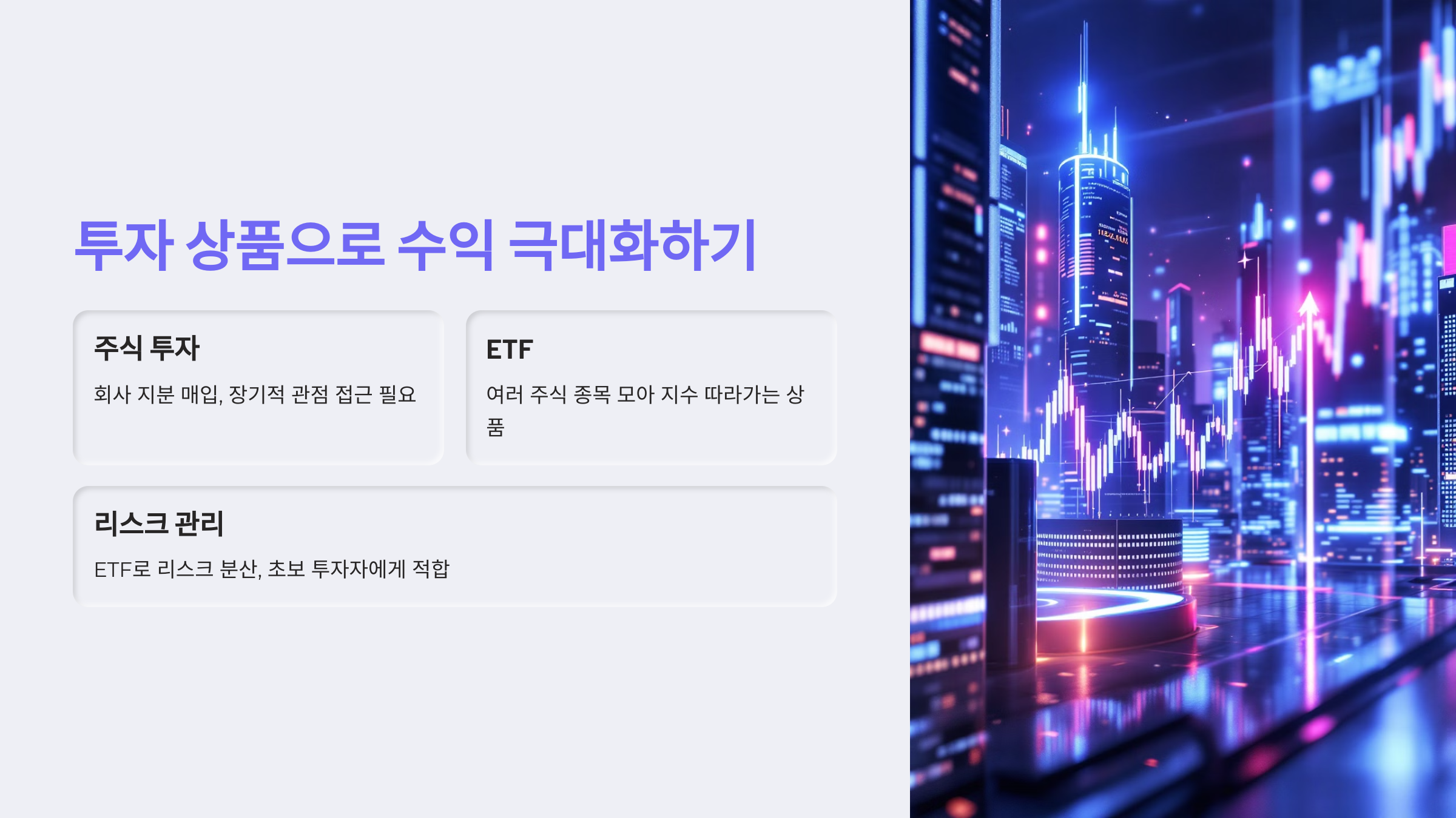 안정적인 예·적금 외에도 재테크의 폭을 넓히기 위해 투자 상품을 알아보는 것이 좋습니다. 다만, 투자 상품은 원금 손실 가능성이 있으므로 신중히 접근해야 합니다.
