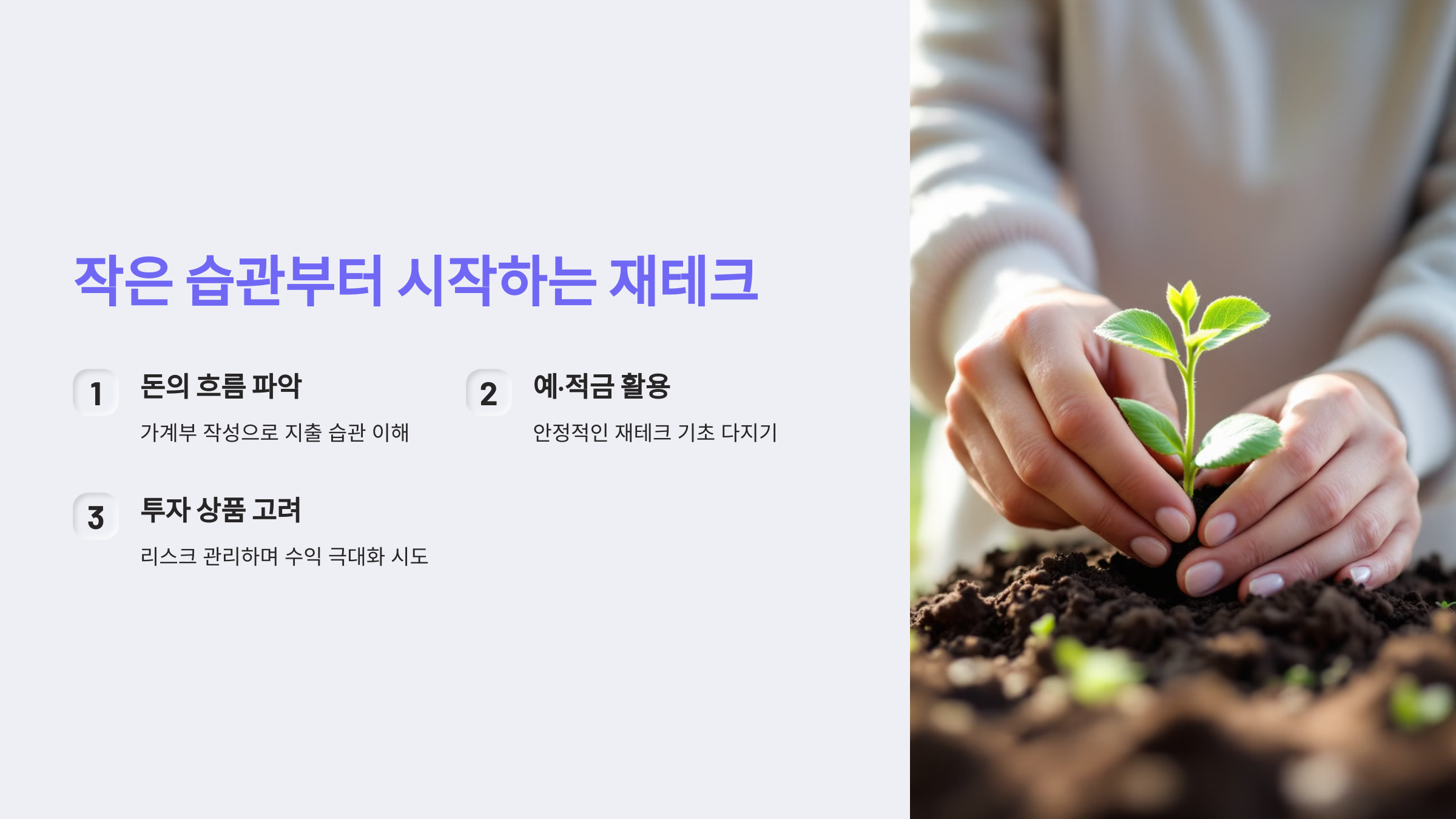 재테크는 거창하게 생각할 필요 없이 작은 습관을 쌓아가는 것이 중요합니다. 돈의 흐름을 파악하고, 예·적금으로 기초를 다지며, 투자 상품으로 수익을 극대화하는 등 하나씩 실천해 나가면 어느새 탄탄한 재정 기반이 마련될 것입니다. 지금 바로 작은 변화부터 시작해보세요! 💪