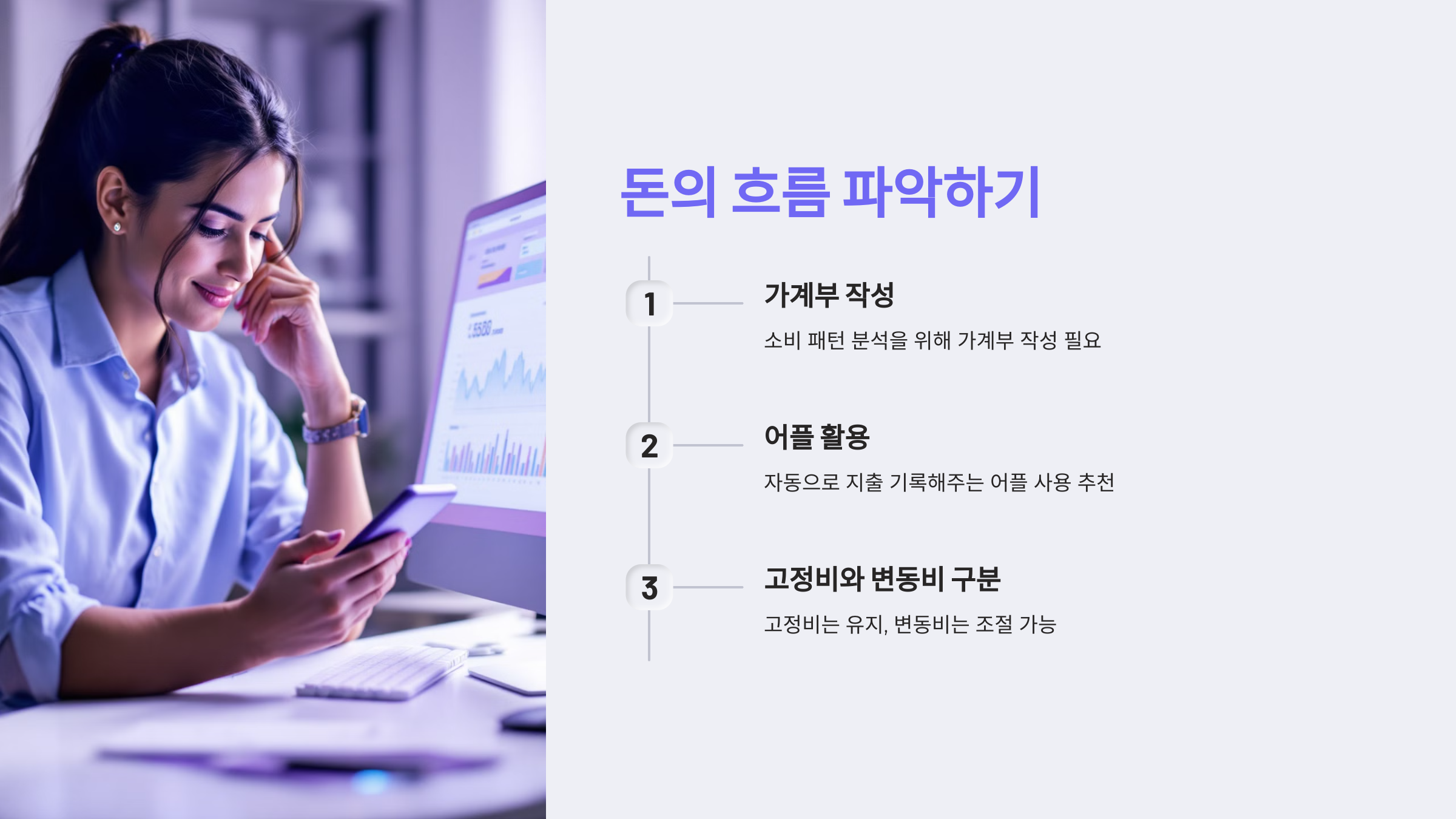 - 고정비를 줄이는 것은 어렵지만 변동비는 조금씩 조절할 수 있습니다. 예를 들어, 한 달에 한 번 외식을 줄이거나 커피값을 절약하는 방법도 좋습니다.