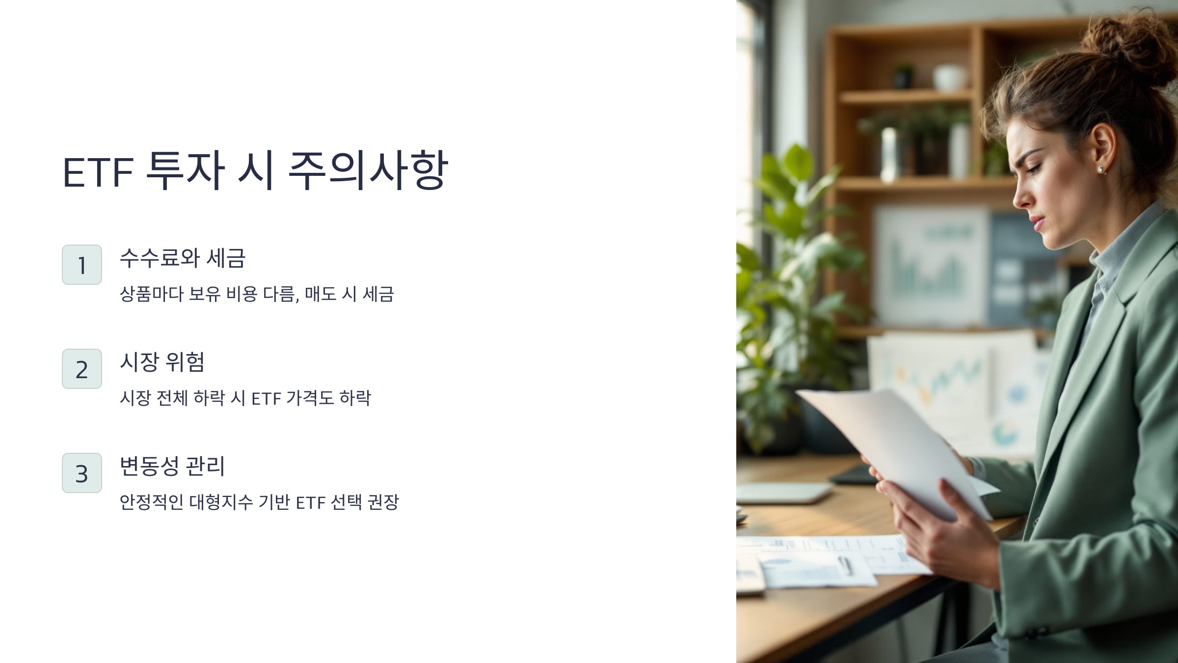 ETF 투자는 간편하고 접근성이 높지만, 몇 가지 주의해야 할 사항이 있습니다.